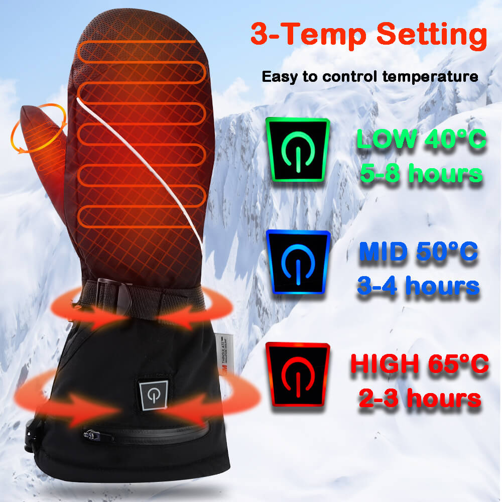 【Fast Heating & 3 Temperature Settings】Heated mittens gloves have three selectable heat settings(high, medium, low) to make sure you can find the exact warmth you need to be comfortable. Heat spread to the entire hands within 30 seconds after turn on and keep you away from the cold anytime